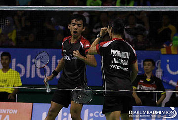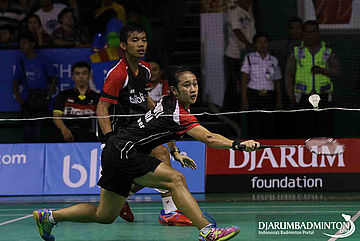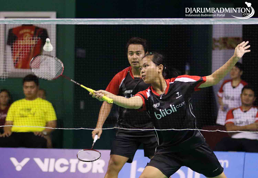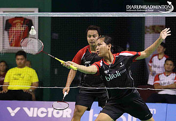 Pramudya Kusumawardana dan Lisa Ayu Kusumawati (Indonesia) Berusaha Mengembalikan Shuttlecock