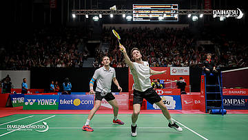 Marcus Fernaldi GIDEON/Kevin Sanjaya SUKAMULJO (Indonesia) mengembalikan serangan