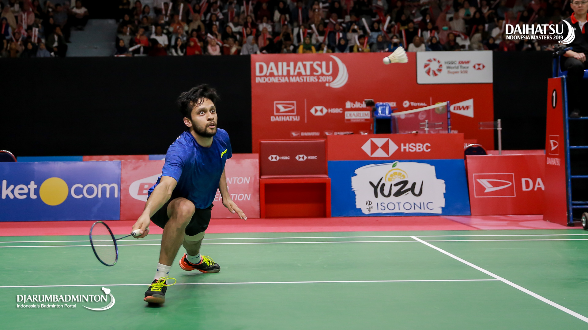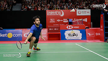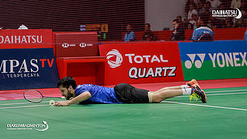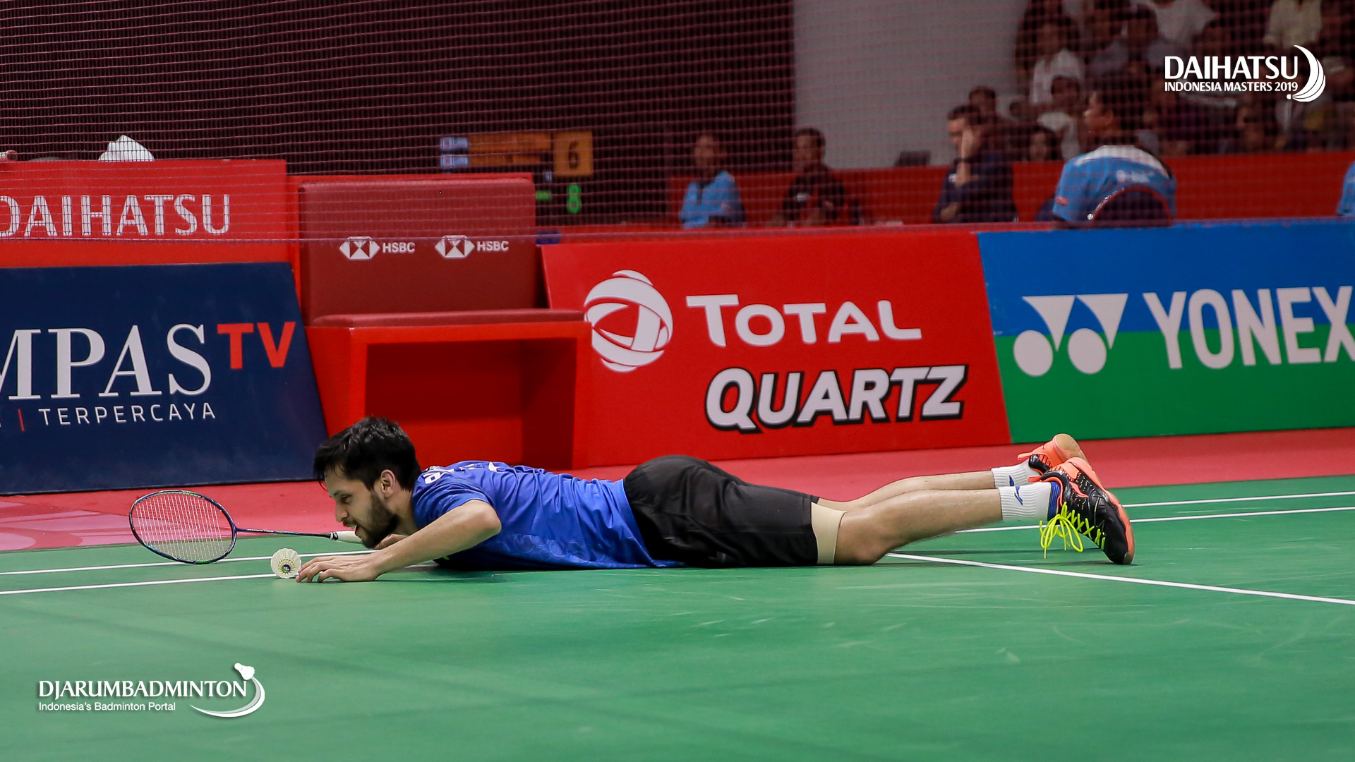 PARUPALLI Kashyap (India) terjatuh saat berusaha mengembalikan serangan
