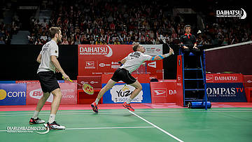 Mark LAMSFUSS/Marvin Emil SEIDEL (Germany) berusaha menggapai shuttlecock