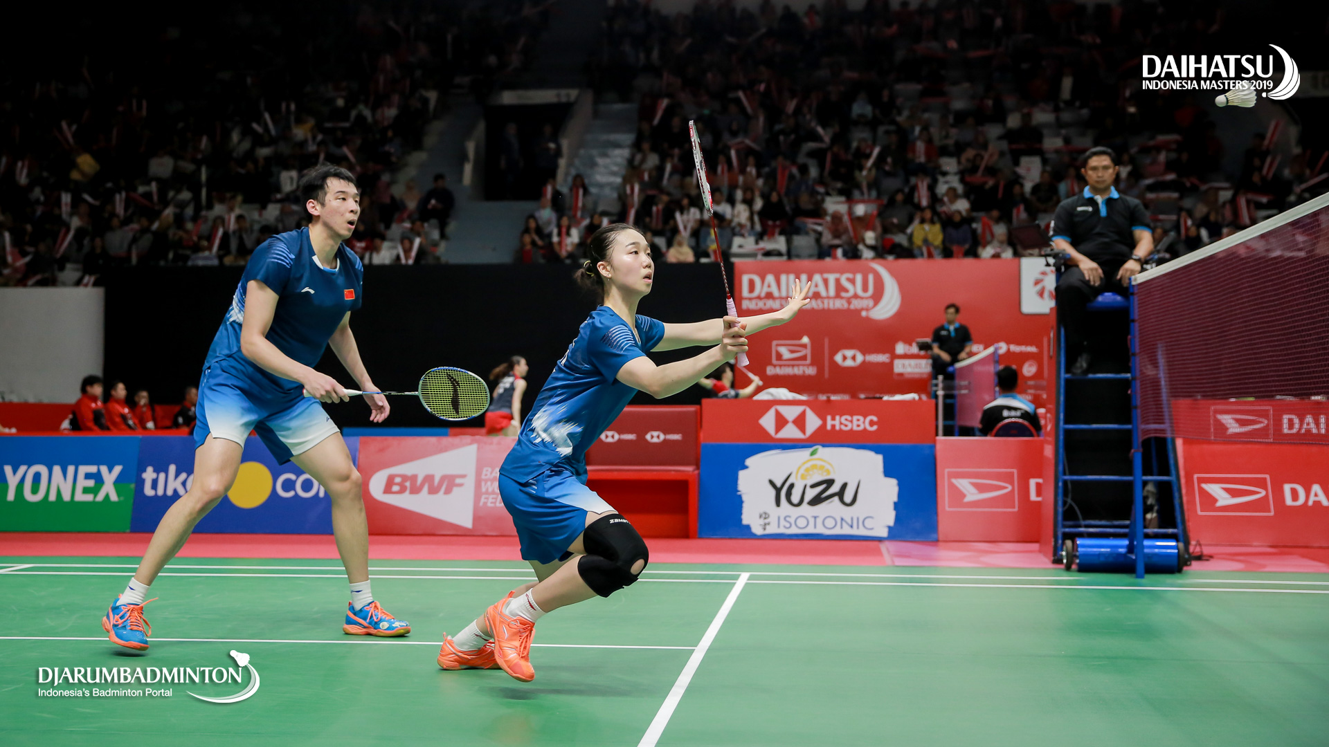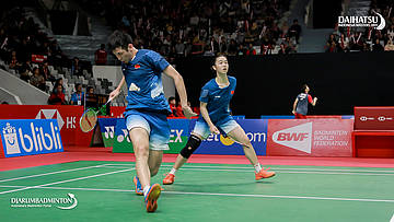 LU Kai/CHEN Lu (Tiongkok) bersiap menyambar shuttlecock