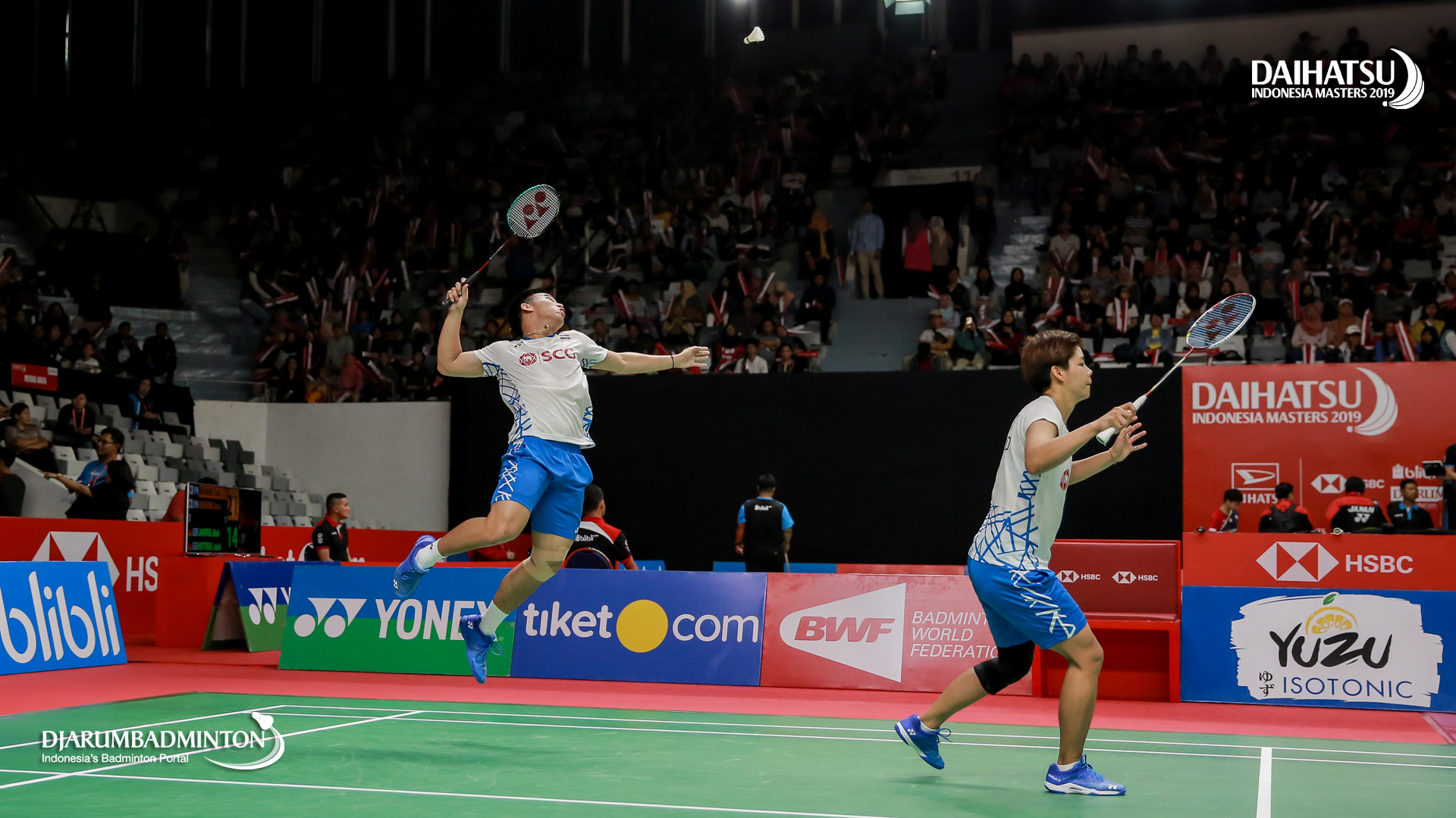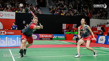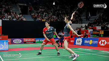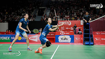 Dechapol PUAVARANUKROH/Sapsiree TAERATTANACHAI (Thailand) bersiap melepaskan serangan