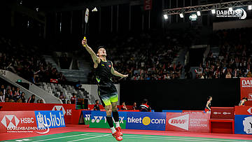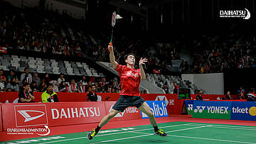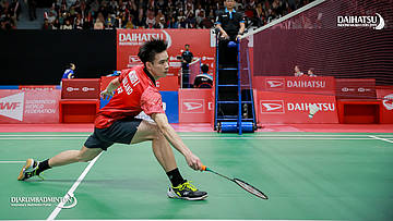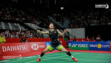 CHEN Long (Tiongkok) berusaha menggapai shuttlecock
