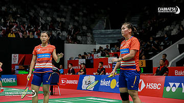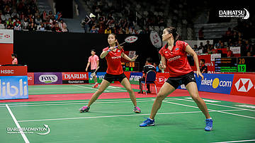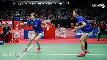 Jongkolphan KITITHARAKUL/Rawinda PRAJONGJAI (Thailand) bersiap menyambut serangan
