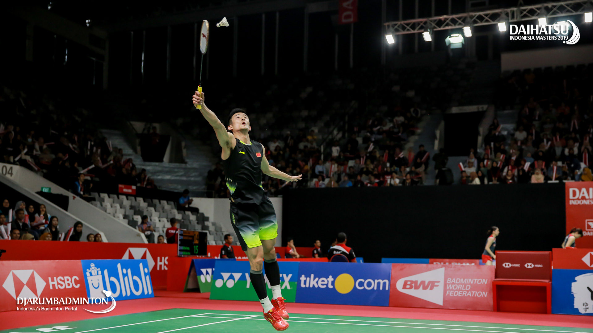 CHEN Long (Tiongkok) mengembalikan shuttlecock