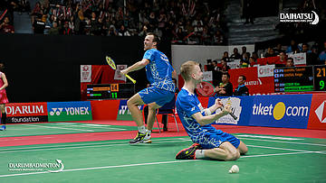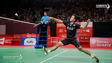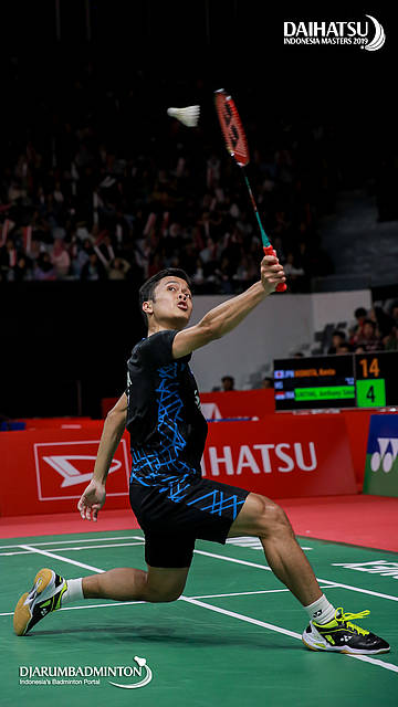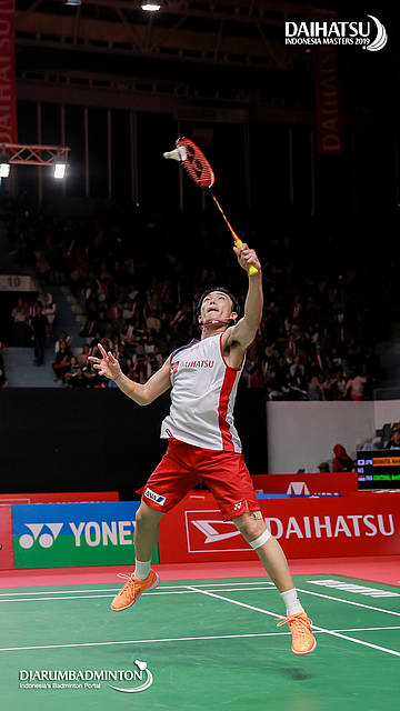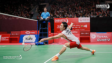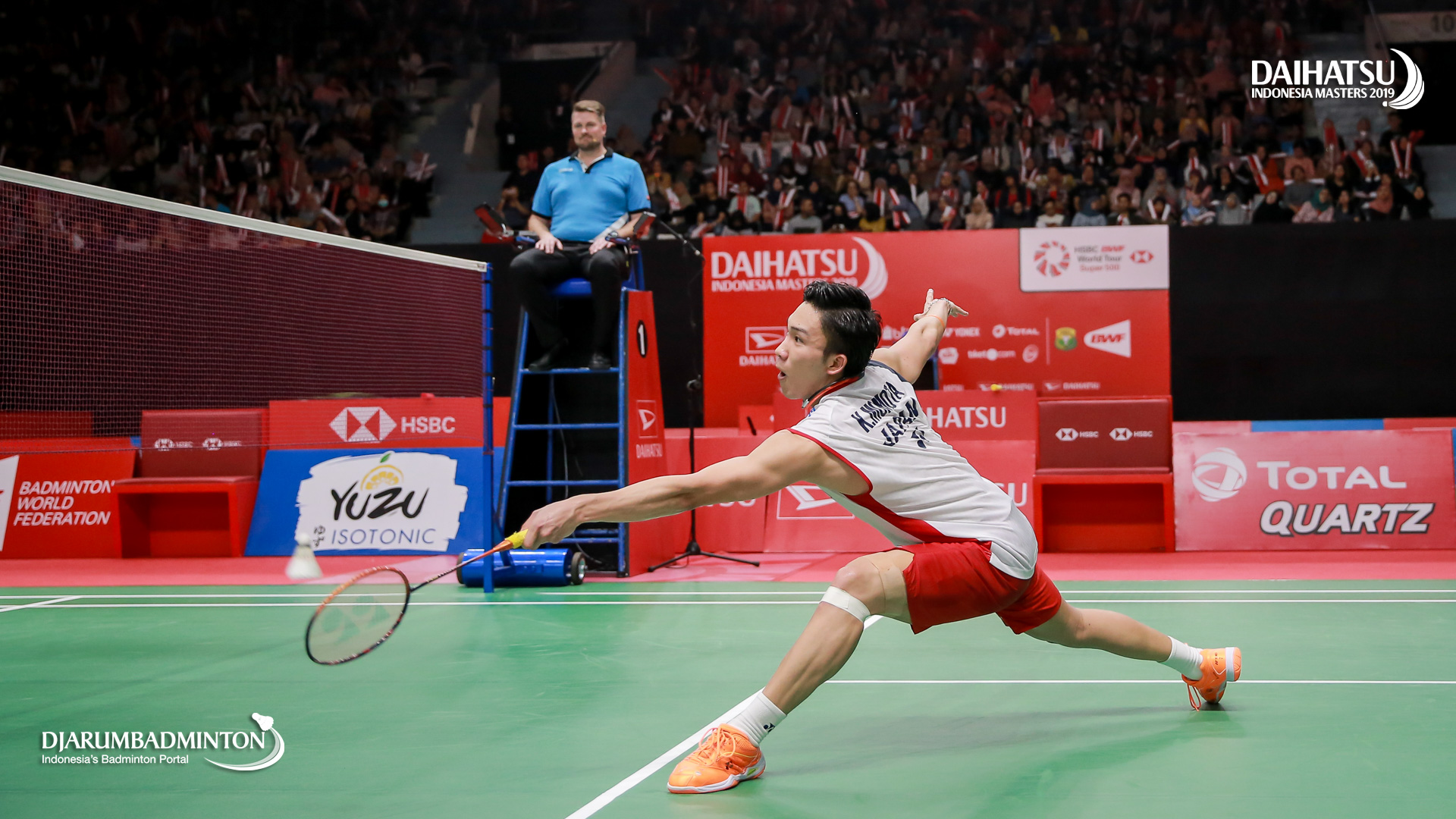 Kento MOMOTA (Japan) berusaha mengembalikan serangan