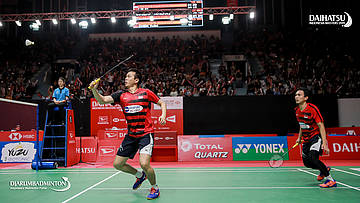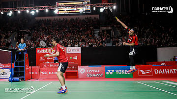 Mohammad AHSAN/Hendra SETIAWAN (Indonesia) bersiap menyambut shuttlecock