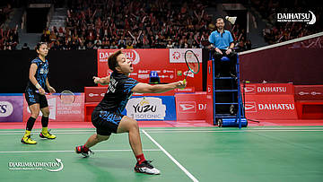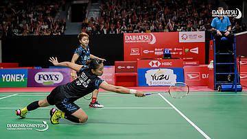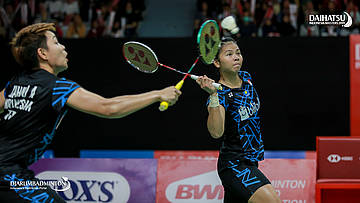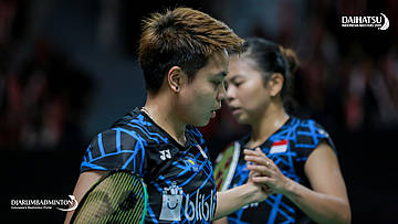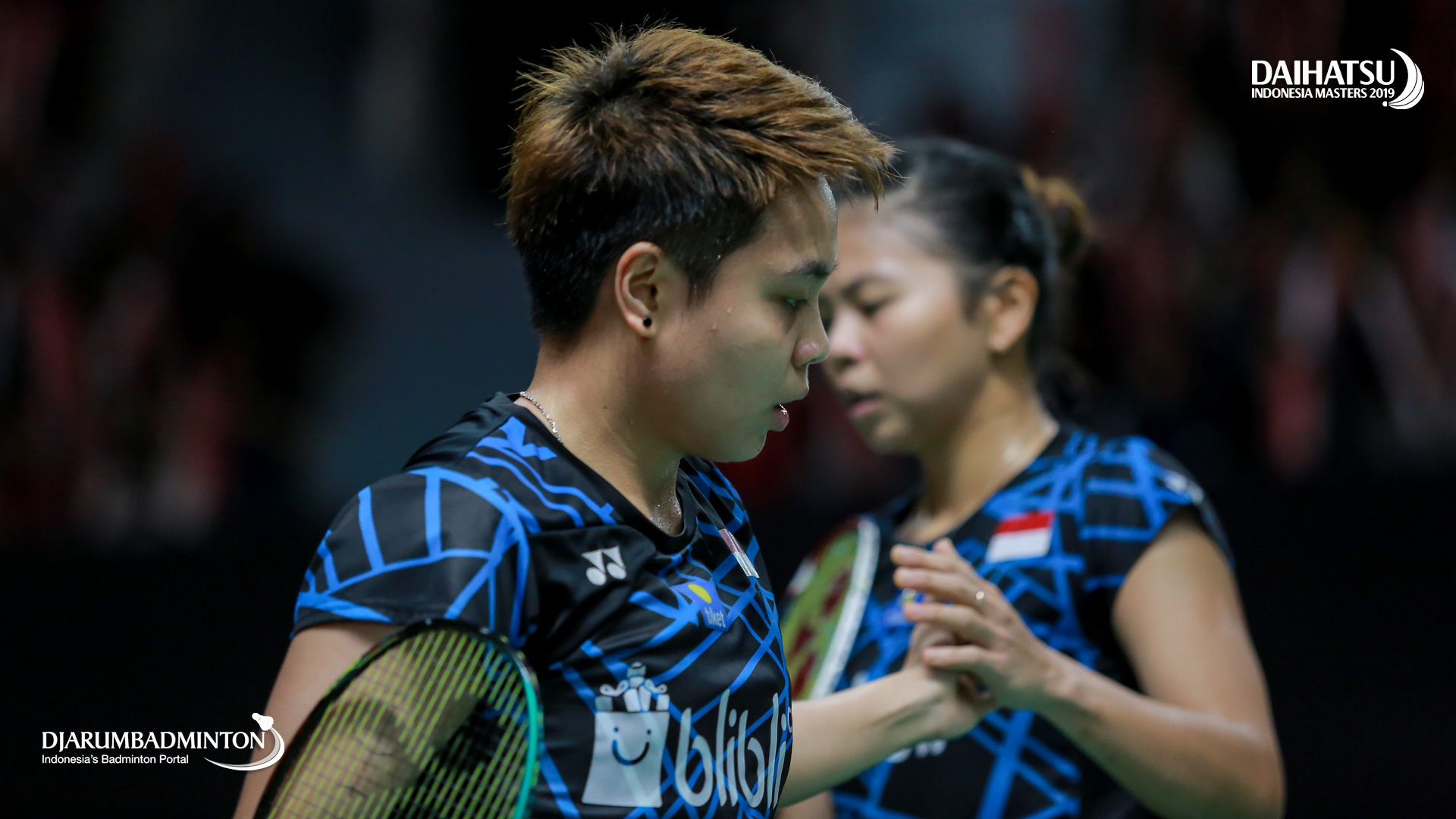 Greysia POLII/Apriyani RAHAYU (Indonesia) menyambut serangan