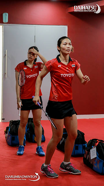 Jongkolphan KITITHARAKUL/Rawinda PRAJONGJAI (Thailand) melakukan pemanasan sebelum bertanding