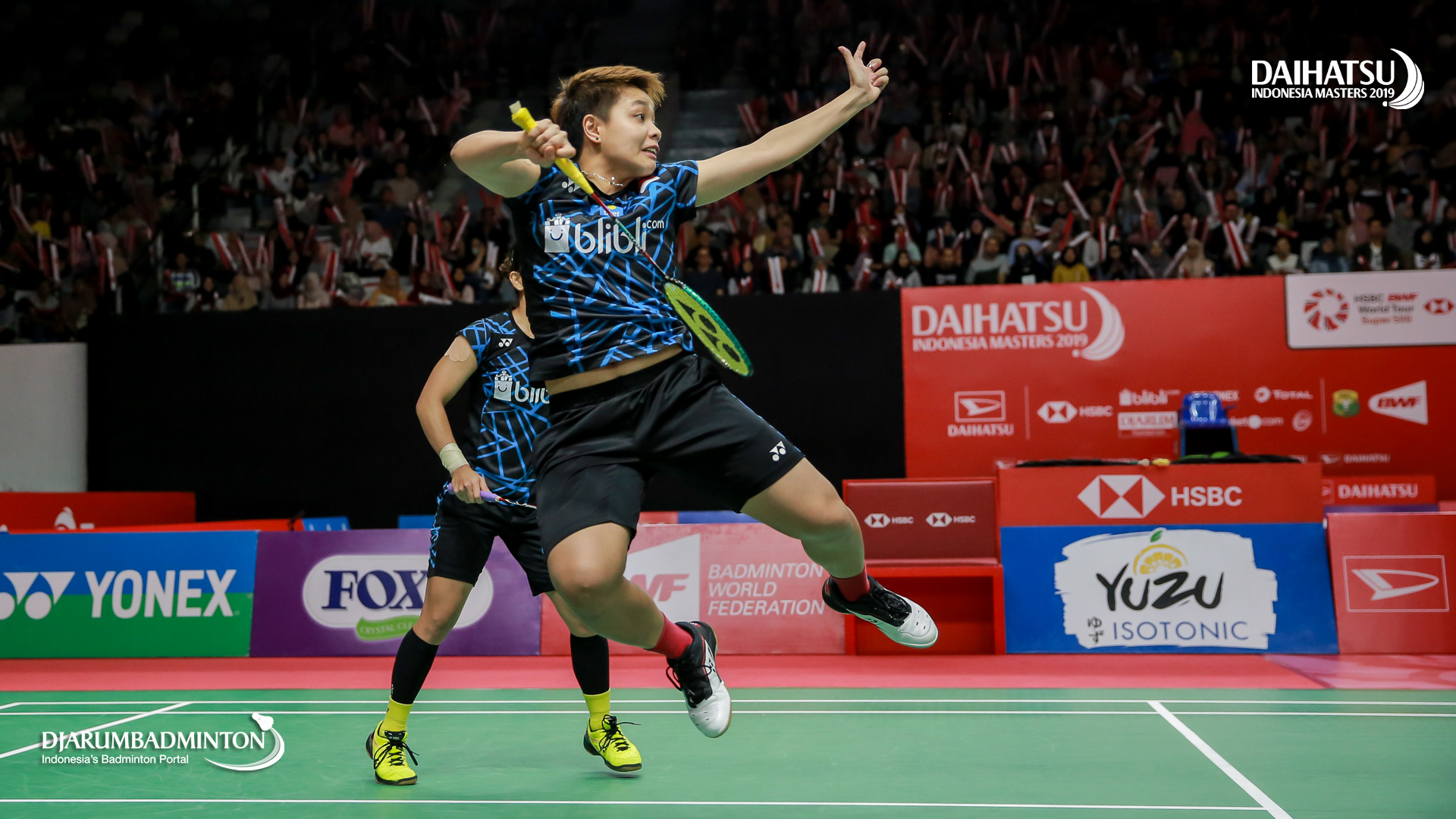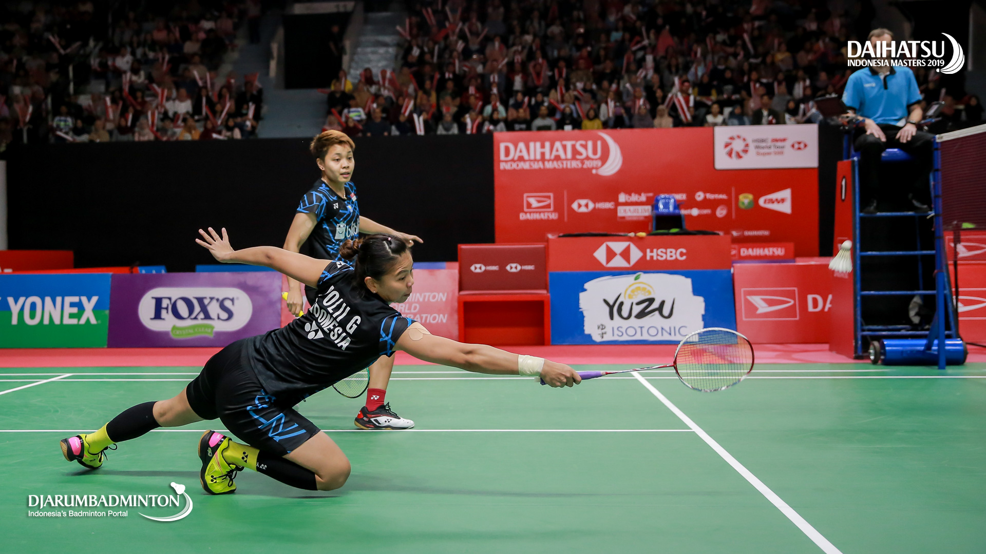 Greysia POLII/Apriyani RAHAYU (Indonesia) berusaha melakukan pengembalian