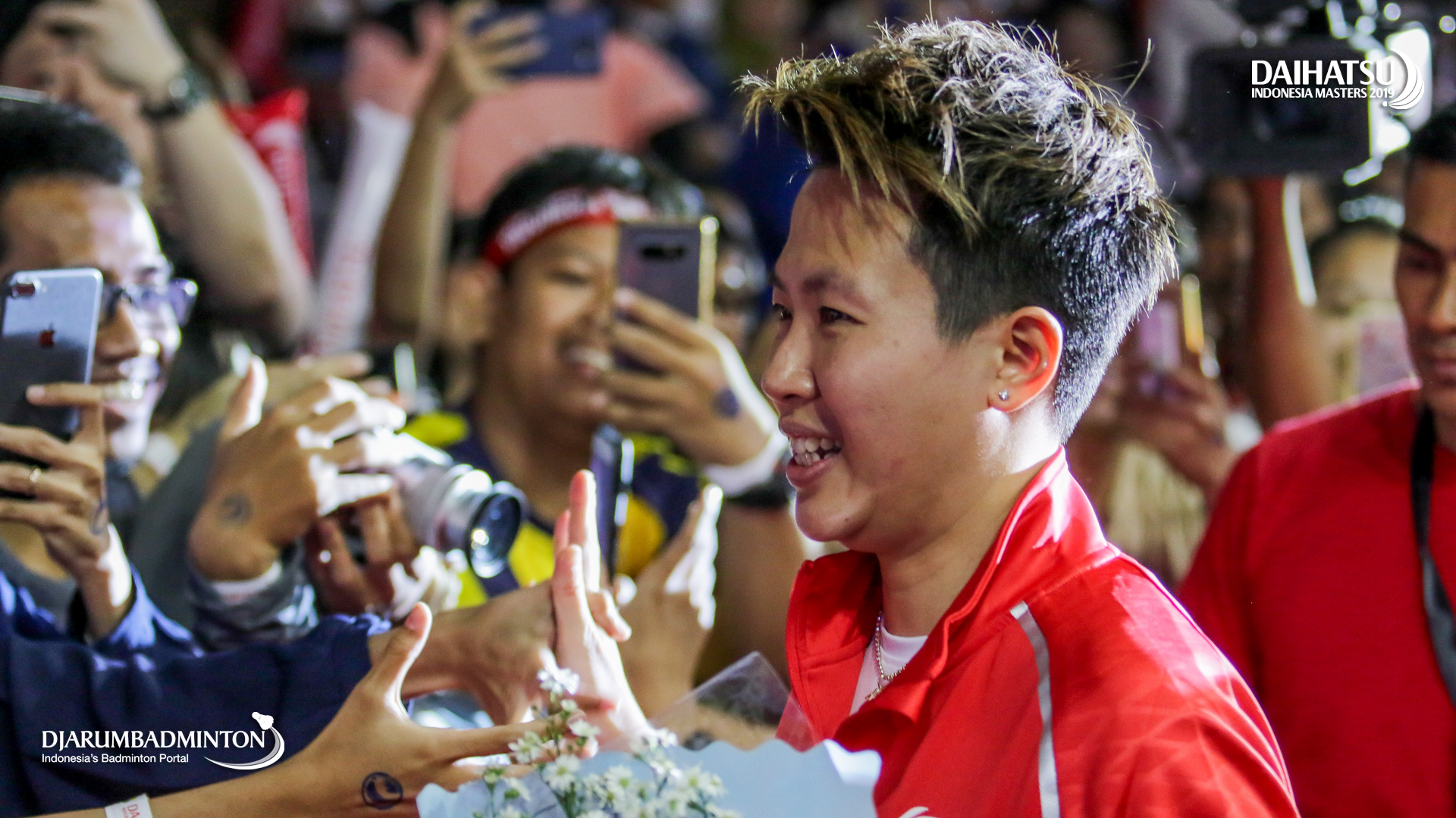 Liliyana Natsir menandatangani kaos bertema ferwell event nya