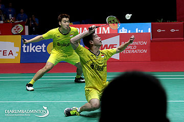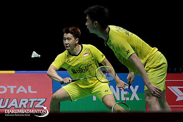 Kevin Sanjaya Sukamuljo/Marcus Fernaldi Gideon (Indonesia) Mengembalikan Shuttlecock