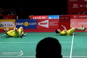 Selebrasi Kevin Sanjaya Sukamuljo/Marcus Fernaldi Gideon (Indonesia) Menjadi Juara Ganda Putra Daihatsu Indonesia Masters 2018