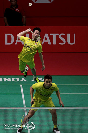 Kevin Sanjaya Sukamuljo/Marcus Fernaldi Gideon (Indonesia) Mengembalikan Shuttlecock