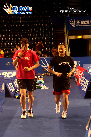 Jwala Gutta (India) mendapatkan arahan pelatih saat berlatih di Istora Senayan
