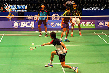 Kashyap Parupalli (India) saat berlatih bertahan melawan tiga temannya