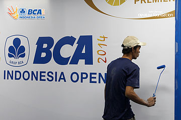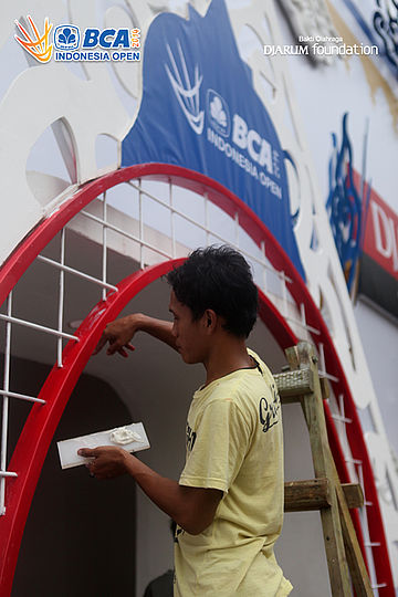 Seorang pekerja terlihat sedang mengecat dekorasi di pintu utama BCA Indonesia Open Super Series Premiere 2014