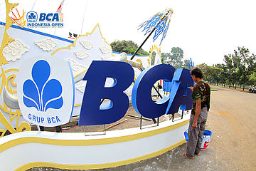 Salah satu pekerja saat mendekor pintu masuk pengunjung BCA Indonesia Open Super Series Premiere 2014