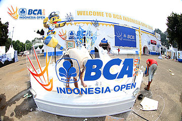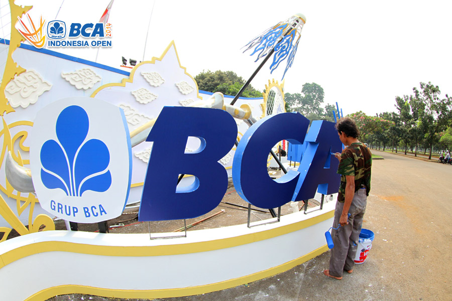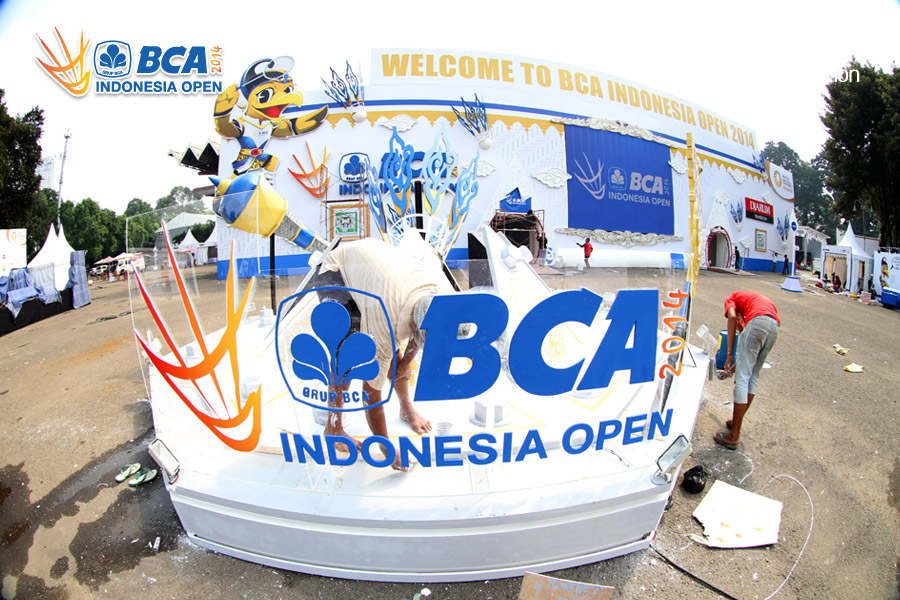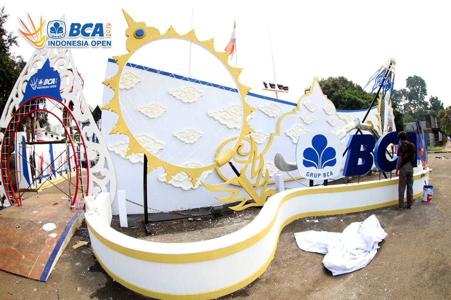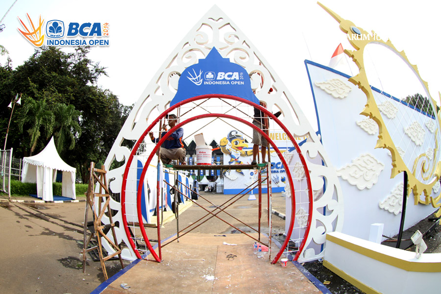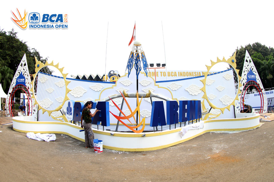Dua orang pekerja saat mengecat dekorasi BCA Indonesia Open Super Series Premiere 2014