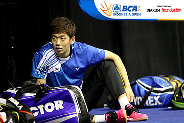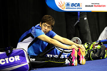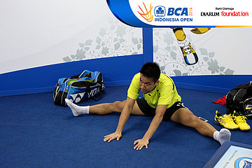 Lee Yong Dae (Korea) melakukan pemanasan di warming up hall