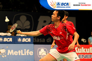 Simon Santoso (Indonesia) mengembalikan shuttlecock ke arah Hu Yun (Hongkong)
