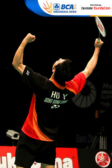 Luapan kegembiraan Hu Yun (Hongkong) setelah berhasil mengalahkan Simon Santoso (Indonesia)