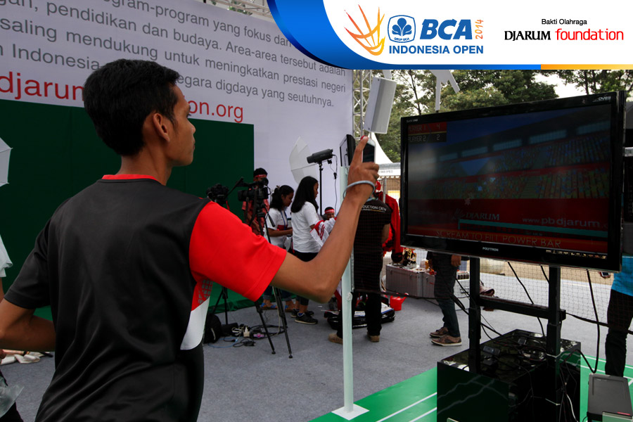 Salah satu pengunjung sedang bermain game di booth Djarum Foundation
