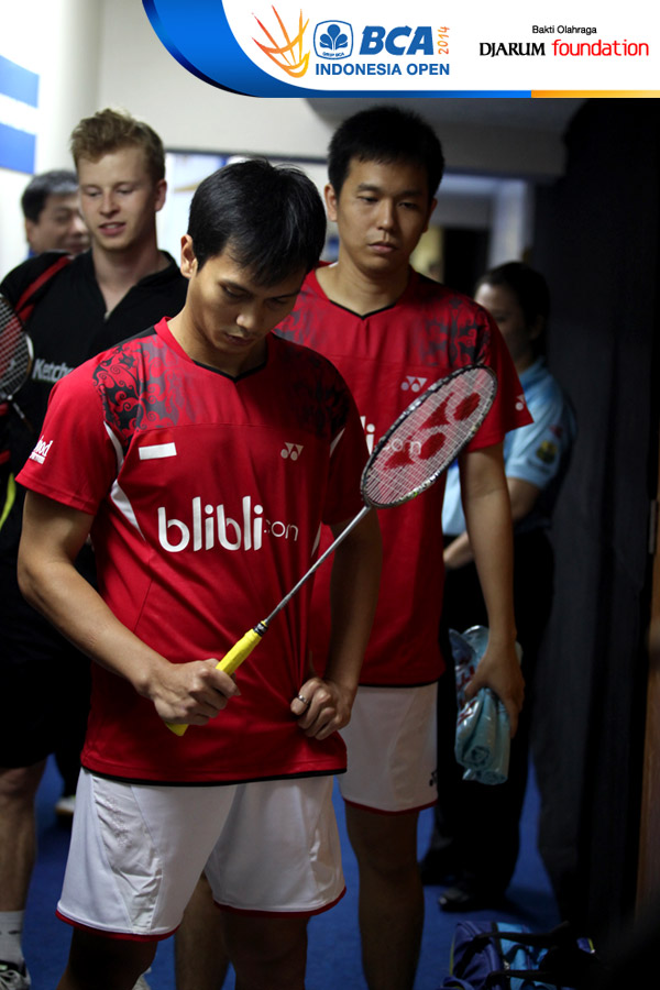 Moh Ahsan/Hendra Setiawan (Indonesia) bersiap memasuki lapangan pertandingan