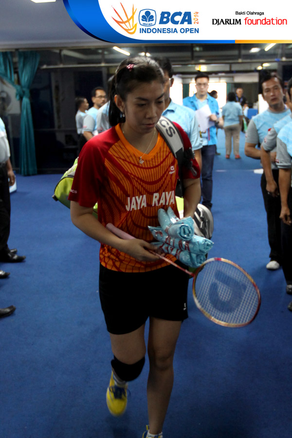 Li Xuerui (China) bersiap memasuki lapangan pertandingan