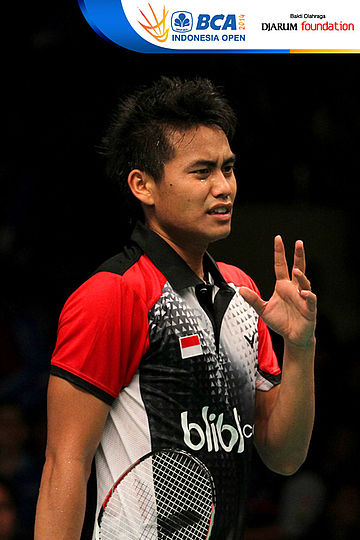 Ekspresi Tontowi Ahmad (Indonesia) saat berhasil mencuri poin dari pasangan Chris Adcock/Gabrielle Adcock (Inggris)