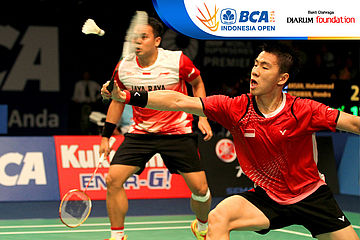 Markus Fernaldi Gideon (Indonesia) harus jatuh bangun menghadang serangan-serangan yang dilepaskan pasangan Hendra Setiawan/Mohammad Ahsan (Indonesia)