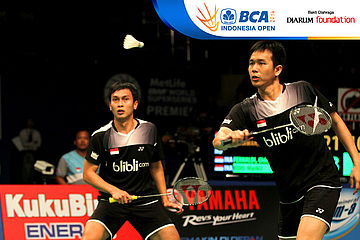 Hendra Setiawan/Mohammad Ahsan (Indonesia) menghadang serangan yang dilepaskan Markis Kido/Markus Fernaldi Gideon (Indonesia)