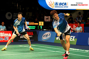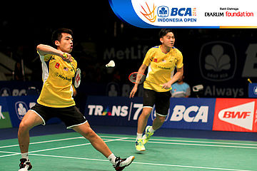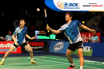 Lee Yong Dae/Yoo Yeon Seong (Korea Selatan) menghadang serangan yang dilepaskan Tan Boon Heong/Tan Wee Kiong (Malaysia)