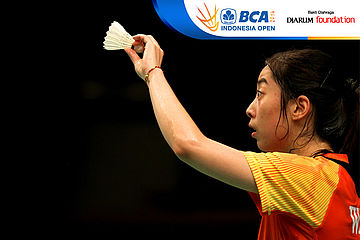 Wang Shixian (China) bersiap mengembalikan shuttlecock ke arah Busanan Ongbumrungpan (Thailand)