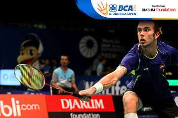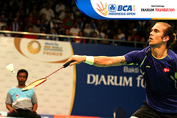 Jan O Jorgensen (Denmark) menyambut pengembalian dari Saon Wan Ho (Korea Selatan)