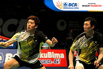 Fu Haifeng/Zhan Nang (China) mengembalikan shuttlecock ke arah Lee Yong Dae/Yoo Yeon Seong (Korea Selatan)