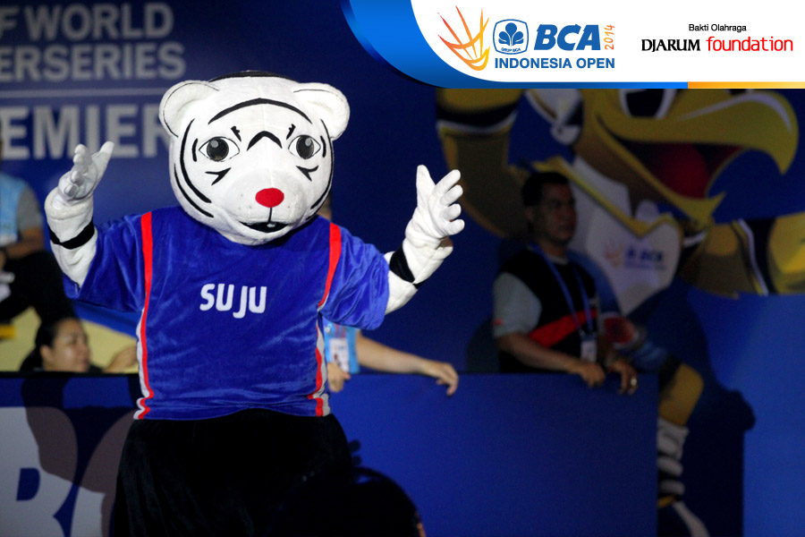 Sejumlah penari dan beberapa Maskot BCA Indonesia Open Super Series Premiere 2014, menari bersama