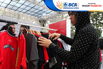 Salah satu pengunjung sedang memilih merchandise di booth Djarum Foundation
