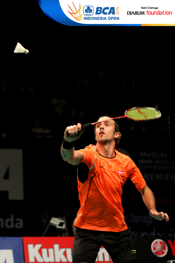 Jan O Jorgensen (Denmark) bersiap melepaskan smash ke arah Kenichi Tago (Jepang)