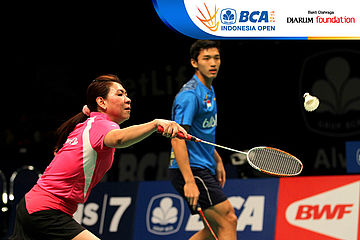 Jonathan Christie/Susi Susanti (Indonesia) saat tampil dalam laga eksibisi BCA Indonesia Open Super Series Premiere 2014