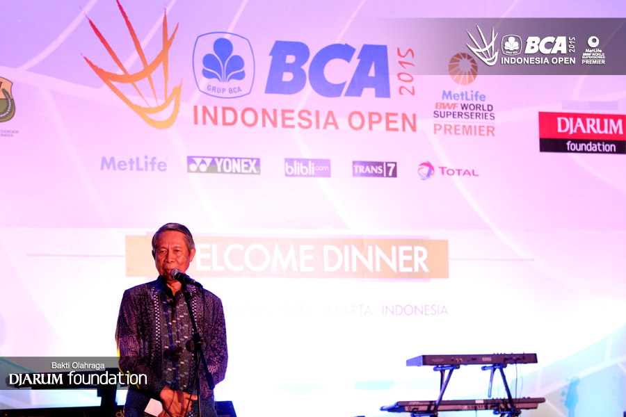 Ketua PP PBSI, Gita Wirjawan saat memberikan sambutan pada acara Welcome Dinner BCA Indonesia Open Super Series Premier 2015.