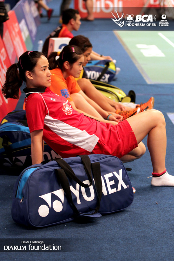 Para pemain tunggal putri Thailand saat bersiap-siap sebelum berlatih.