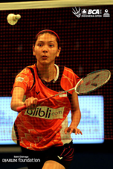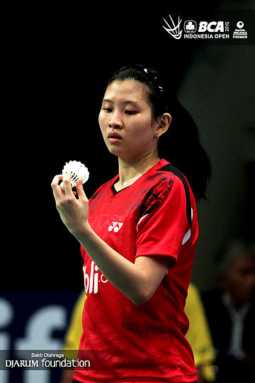 Debby Susanto (Indonesia) memeriksa shuttlecock saat berlatih.