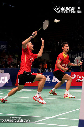 Hardianto/Kenas Adi (Indonesia) mengembalikan shuttlecock ke arah Liu Cheng/Lu Kai (China).