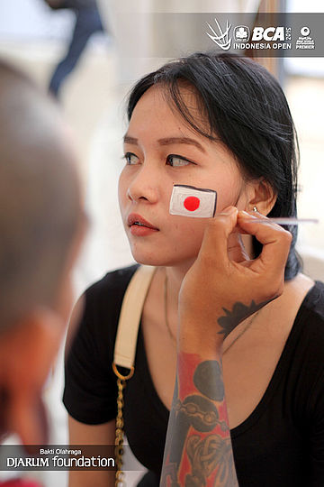 Fasilitas face painting BCA Indonesia Open Super Series Premier 2015 saat merias wajah salah satu pengunjung.
