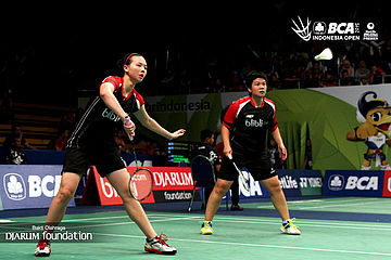 Ririn Amelia/Ristya Ayu (Indonesia) bersiap menyambut pengembalian dari Chan Kaka/Yuen Sin Ying (Hongkong).
