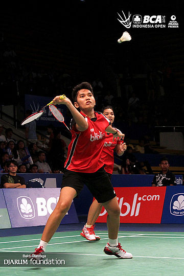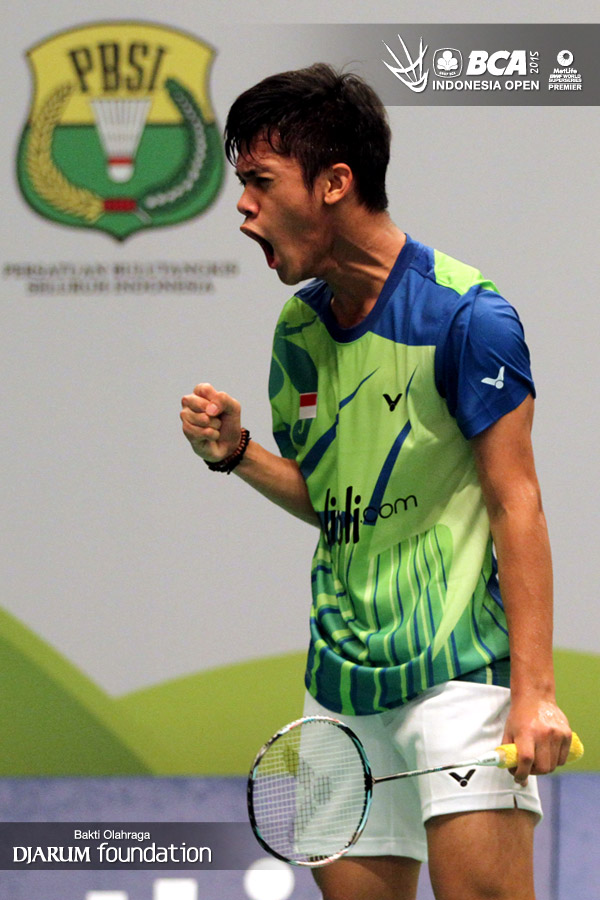 Ekspresi Firman Abdul Kholik (Indonesia) saat berhasil mencuri poin dari Jonathan Christie (Indonesia).