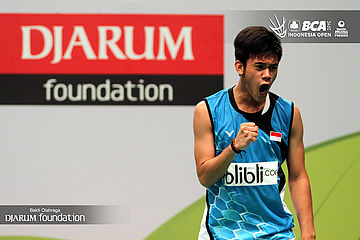 Selebrasi Jonathan Christie (Indonesia) setelah berhasil mengalahkan Firman Abdul Kholik (Indonesia).