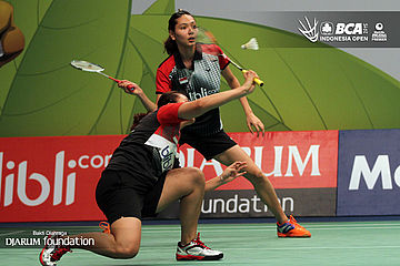 Gloria Emanuelle/Melati Daeva (Indonesia) menghadang serangan yang dilepaskan Annisa Saufika/Rika Rositawati (Indonesia).