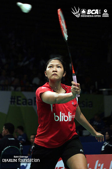 Lindaweni Fanetri (Indonesia) menyambut pengembalian dari Gregoria Mariska (Indonesia).